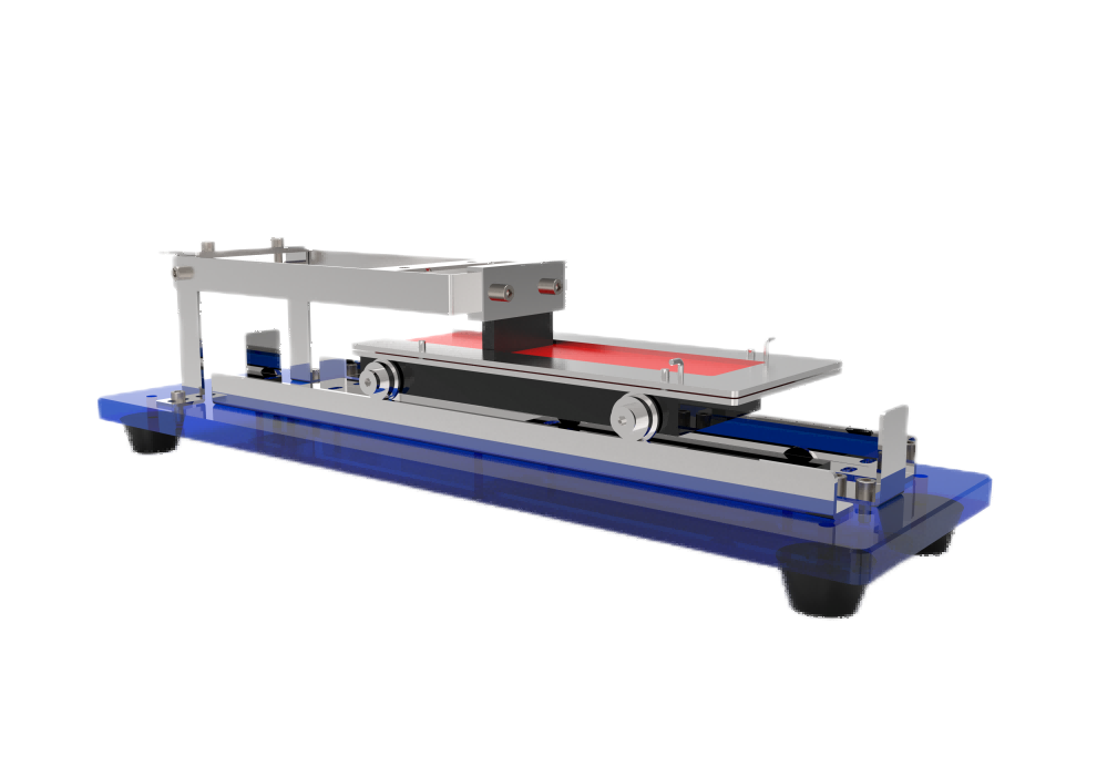 用于制备试样,由底板、导轨、滑动架、模板和毛刷构成。滑动架底部装四个轮子,可沿导轨方向前后移动,它的移动距离略大于152mm。模板尺寸略小于试样夹内框尺寸,厚度为2.0mm。毛刷由两排直径为 0.41 mm 的尼龙丝簇组成,两排毛簇交错排列,每簇20根丝,每25mm有4簇。毛簇平整,长度为19 mm。毛刷对试样向下施加150cN士5cN的力